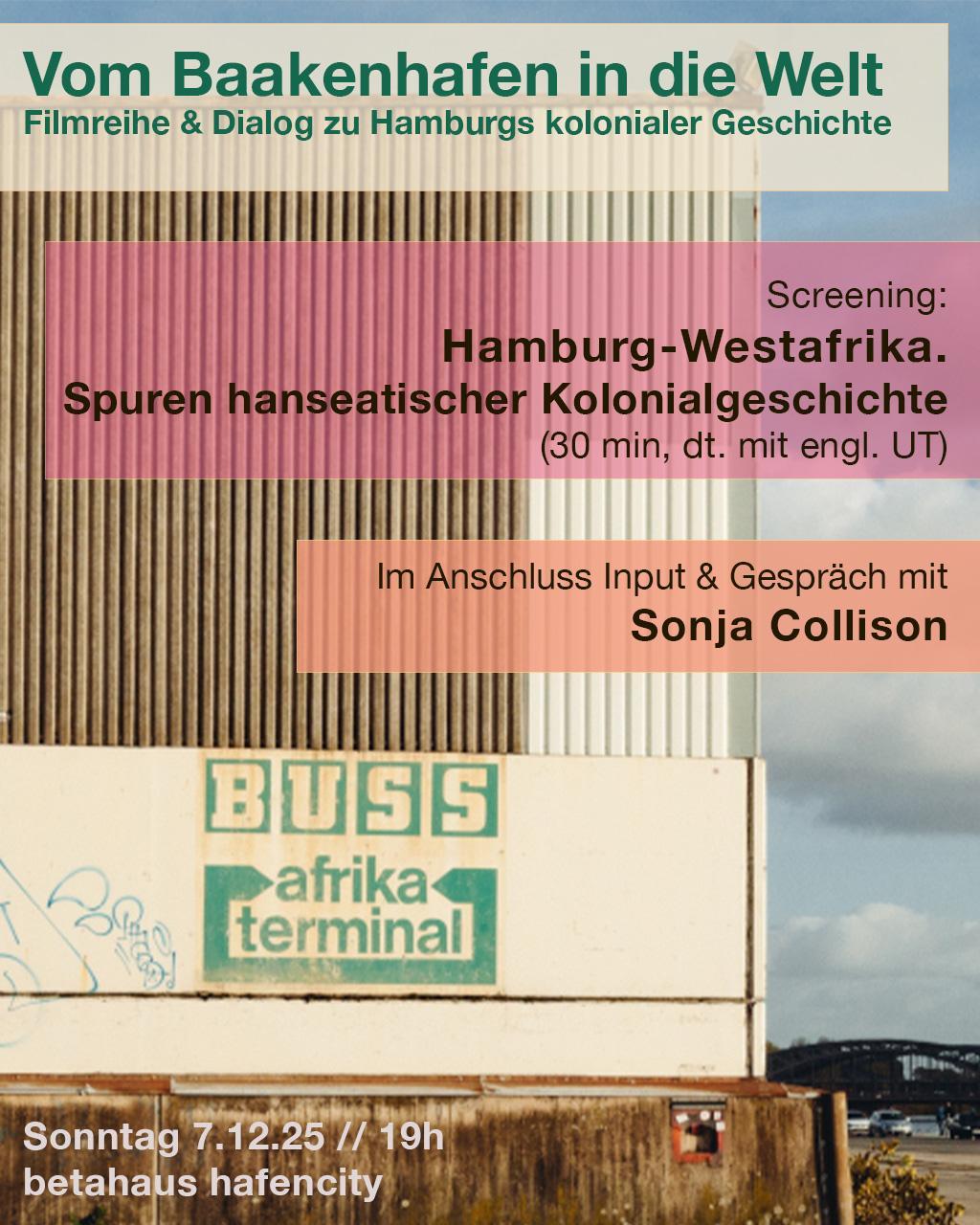 Gezeigt wird die Dokumentation Hamburg-Westafrika. Spuren hanseatischer Kolonialgeschichte (30 min, deutsch mit engl. UT).