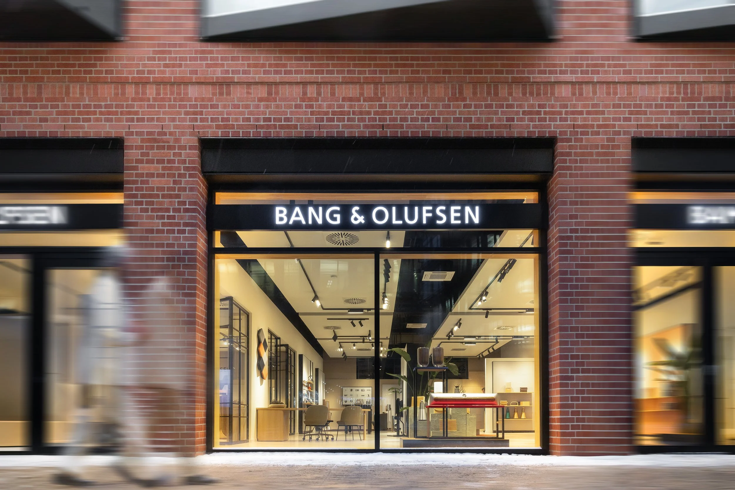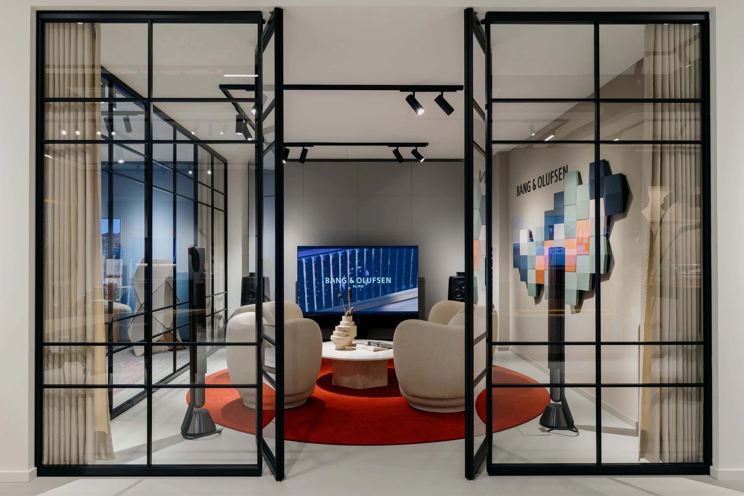 Die Geschäftsführer Arndt Piechulek, Dennis Marquardt-Garten sowie Enzio von Eisenhart-Rothe berichten, wie in 100 Jahren aus einem Dachboden-Projekt zweier junger dänischerIngenieure ein weltweit gefeiertes, vielfach ausgezeichnetes und für herausragendes Design und innovative Technik stehendes Unternehmen wurde. Die ikonischen Meisterwerke Beolab 90 und Beovision Harmony sorgen dann in den zwei großzügigen Lounges, dem akustischen Herz des 250 m2 großen Erlebnisraumes, für Gänsehaut.